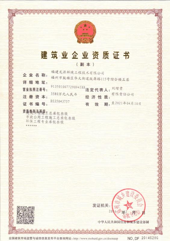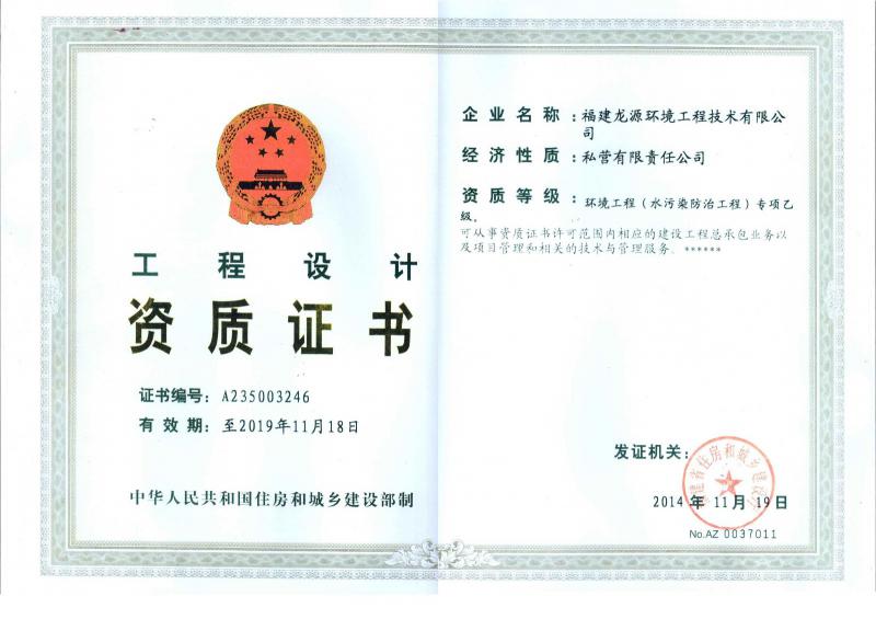 公司简介:福建龙源环境工程技术有限公司于2005年在历史文化名城-福州成立,系福建省环境保护产业协会理事单位。是一家致力于环境污染综合治理的高新技术企业。公司倡导低碳生活,以“致力环保、平衡生态、构建和谐、持续发展”为经营宗旨,凭借核心技术和人才优势、管理和运营经验,成为集环境污染防治技术研发、咨询设计、投融资、工程建设及运营管理为一体的环保行业综合服务商。